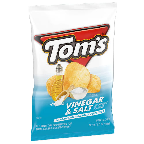 Tom’s Chips come in a wide range of flavors, including classic salted, vinegar & salt, BBQ, sour cream & onion, and specialty seasonal flavors depending on availability.